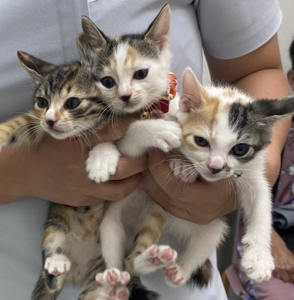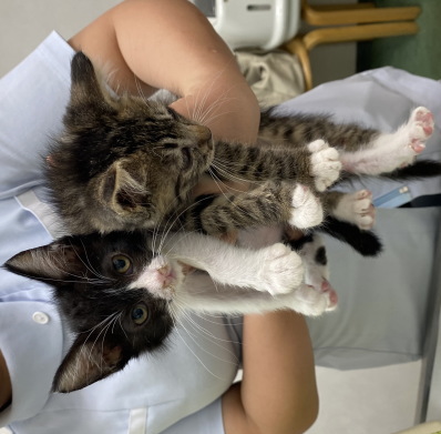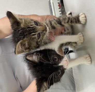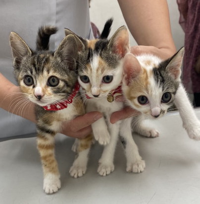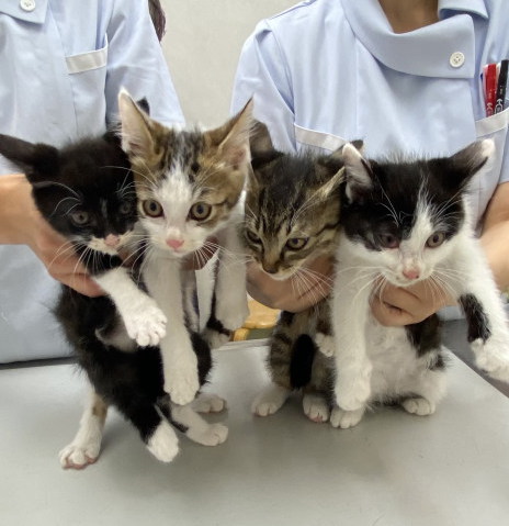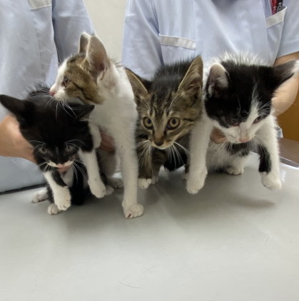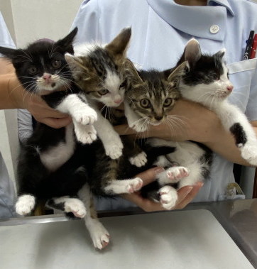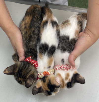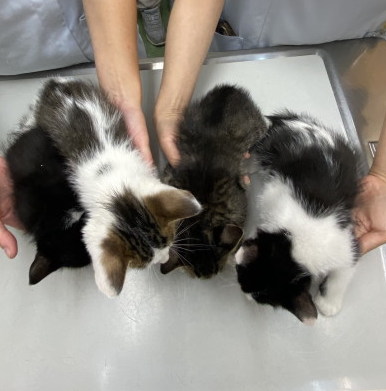 2024.10.28掲載 ◆当院の患者さんが保護しました。 ◆約2か月齢の子猫3匹です。オス・メスいます。 ◆猫エイズウイルス、猫白血病ウイルス:検査済み(陰性) ◆食欲元気あり。